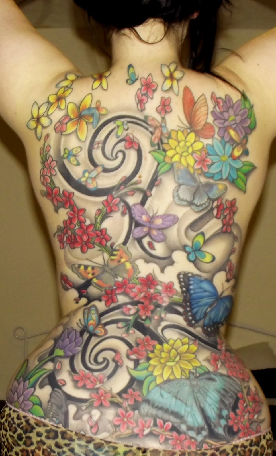 Didn't put me off though. Inspired by a piece by Ian Flowers we decided to do a few more butterflies, but it was never enough so H drew up my full back piece and we did bits whenever we could. It was all finished by April 2009 ready for my trip away for 6 months. When I got back, I had 6 Frangipani flowers added at the top for the months I was away. It does extend down but I don't think my bare bottom needs to be on the internet - haha! My next piece will either be extending my feet tattoos or my left 3/4 sleeve BUT one day I do want to work on my sides, and it will definitely flow into my sleeves / onto my chest a little. I love expandable tattoos and hate that my only boundary will be the end of a limb.